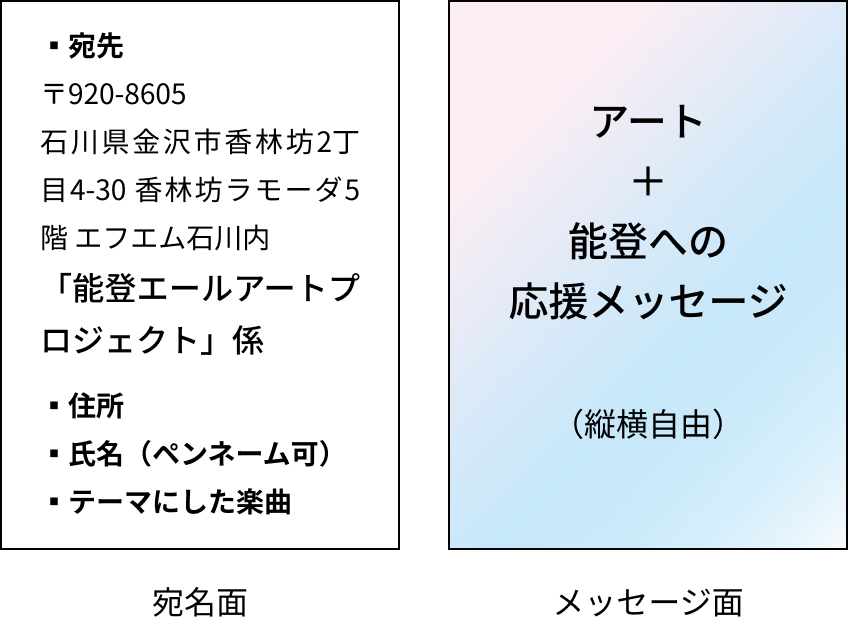 ユーミンの対象楽曲から1曲を選び、そのテーマや世界観を自由にアートで表現し、応援メッセージを添えた“エールアートはがき”としてご応募ください。